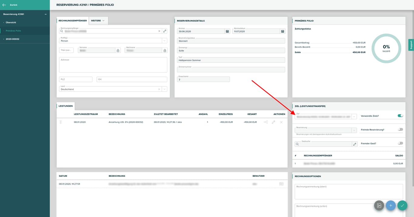 Unter "Verwandte Ziele" beim Leistungstransfer finden Sie nun auch alle zukünftigen Reservierungen des gleichen Gastes. Einzige Voraussetzung: Bei beiden Reservierungen wurde das gleiche Gästeprofil als Hauptgast auf der Zimmerreservierung eingetragen.