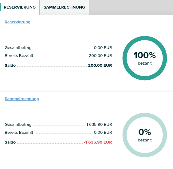 Sofern sich auf der Rechnung des Hauptgastes, der Firma oder der Sammelrechnung ein offener Saldo befindet, wird diese direkt in der Reservierung angezeigt, ohne auf den Tab "Sammelrechnung" wechseln zu müssen. Dadurch verringert sich das Risiko, dass offene Leistungen auf anderen Rechnungen übersehen werden.