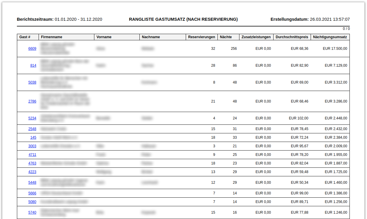 Im Bericht "Rangliste Gastumsatz (nach Reservierung)" werden alle Umsätze eines Gastes nach Reservierung (nicht nach Rechnung - gleiche Datenquelle wie Umsatzprognose) für einen bestimmten Zeitpunkt aufsummiert. Damit wird die Verhandlung von firmenspezifischen Raten für Stammkunden deutlich erleichtert, da man konkrete Daten vorliegen hat auf denen man eine Entscheidung treffen und auch argumentieren kann.