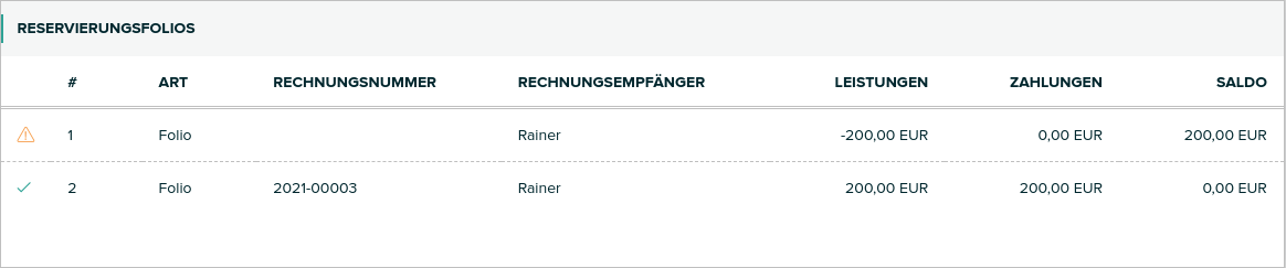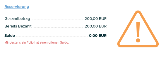 Hat eine Reservierungs- oder Gastrechnung einen ausgeglichenen Saldo, aber es wurde z.B. vergessen eine Rechnung zu erstellen, so wird nun anstatt 100% bezahlt ein großes oranges Rufzeichen angezeigt.